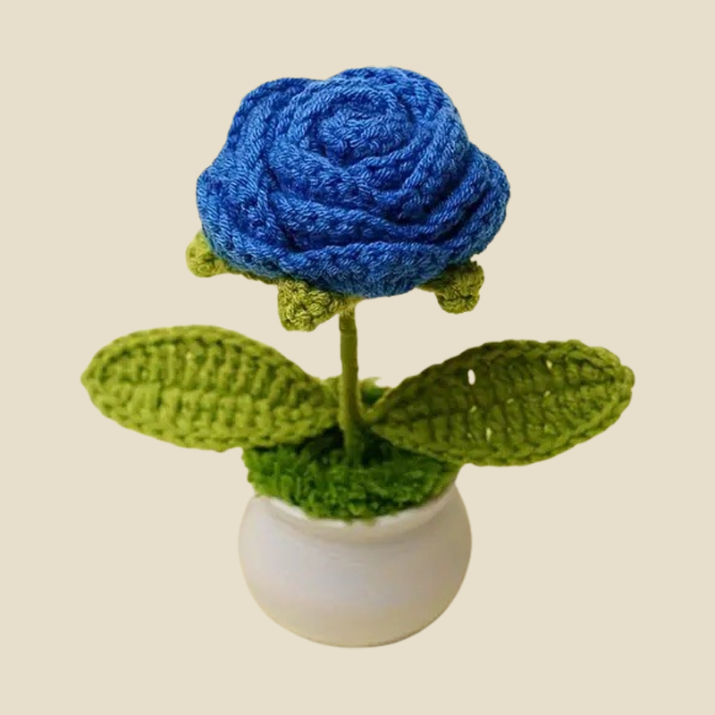 かわいい鉢に入った手作りの青いかぎ針編みのバラ。どんな空間にも魅力を添えるのに最適です。ご自宅用や心のこもった贈り物として、ユニークでいつまでも咲き続ける花です。